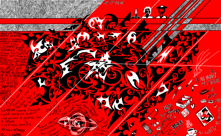 Questo lavoro rappresenta un intreccio di percezioni personali e universali, linee, forme, e colori contrastanti, ove lo spettatore può perdersi nei dettagli, trovando e adattando un proprio significato all'opera.